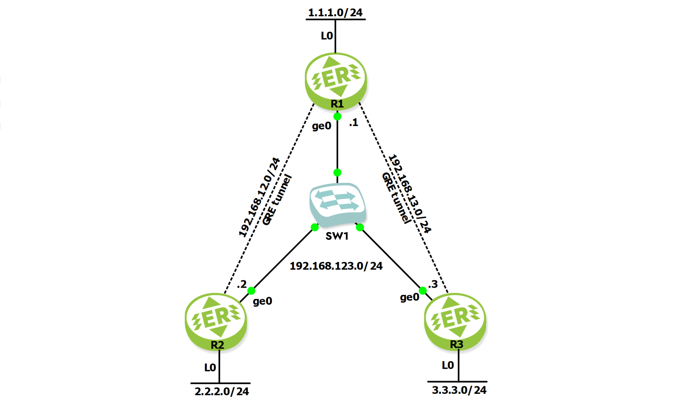 Обратите внимание, что при настройке маршрутизации OSPF указываются не физическая подсеть объединяющая все три маршрутизатора, а подсети образуемые туннелями GRE.