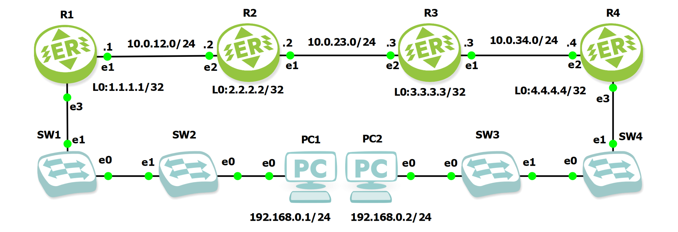 Обратите внимание что для соединения R1 и R2 с PC1 и PC2 не настроен IP-адрес и интерфейс. Связность происходит на L2-уровне. PC1 и PC2 взаимодействуют как два напрямую соединённых устройства.