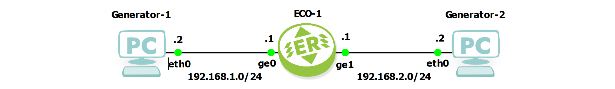 Схема состоит из маршрутизатора EcoRouter посередине и двух оконечных устройств выступающих в роли генераторов трафика.